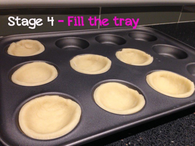 Now, put a small spoonful of mincemeat in each one, but be careful not to put too much, as the pastry will melt and the mincemeat will bubble out if it has no room to spare.