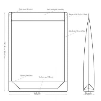 - Closure: Resealable zip lock + heat seal compatible